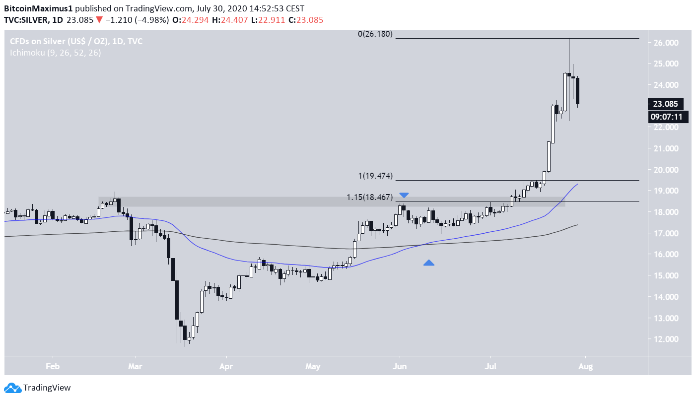 Sponsored SponsoredEm 28 de julho, a prata criou um Doji de sombras longas, atingindo uma alta de US $ 26,18, e caiu ligeiramente desde então. O Doji normalmente é um sinal de reversão quando ocorre uma tendência de alta, sugerindo que o preço cairá em breve. Isso seria confirmado por um fechamento diário abaixo de US $ 22,50, que completaria um padrão de estrela da noite.