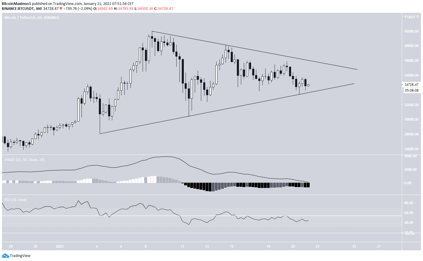 O gráfico de seis horas dá suporte para esse cenário, pois mostra que o BTC está sendo negociado dentro de um triângulo simétrico e saltou em sua linha de suporte ontem. A linha de resistência do triângulo está atualmente em $ 37.700.