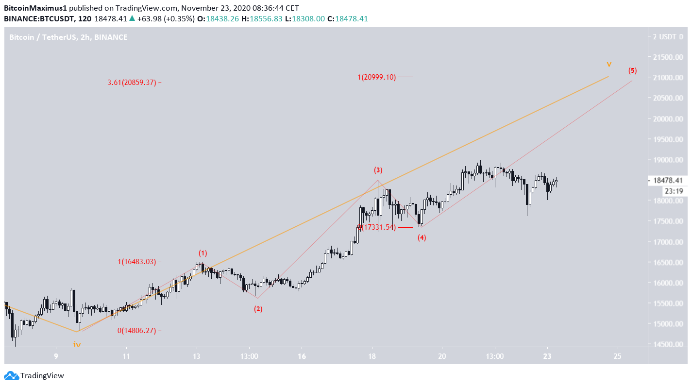 A contagem de onda mais provável para BTC sugere que o preço está na quinta e última sub-onda menor (vermelho) da quinta sub-onda (laranja) de um impulso de alta de longo prazo que começou em março.