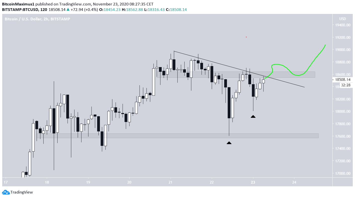 O gráfico de duas horas mostra uma faixa de negociação entre $ 17.600 – $ 18.600. Embora o preço tenha sido inicialmente rejeitado pela área de resistência, ele criou uma sombra inferior muito longa, uma vez que atingiu o suporte, e seguiu com a criação de uma mínima mais alta (mostrado nas setas pretas abaixo).