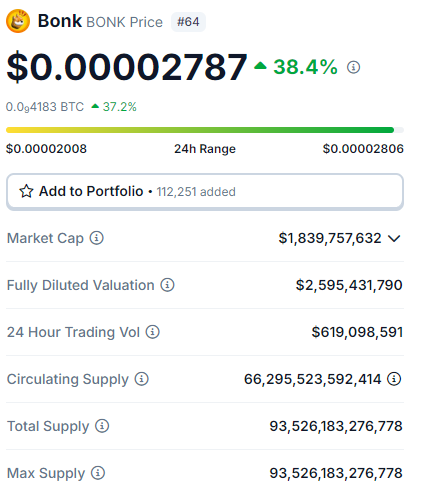 Logo na sequência da HBAR vem a BONK, que viu o seu preço subir mais de 38% no dia. Com isso, a altcoin chegou a uma valorização semanal de quase 100%.