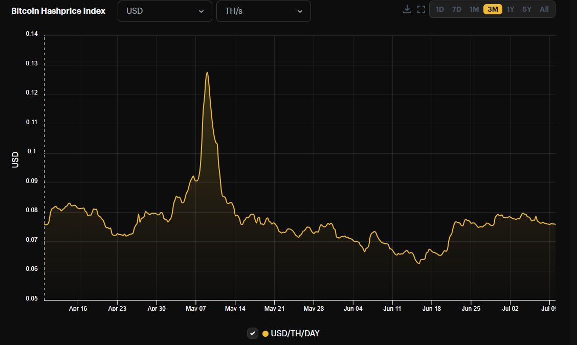 Além disso, todos esses fatores colocarão mais pressão sobre os mineradores de Bitcoin, pois o preço do hash continua caindo. O preço do hash, ou lucratividade da mineração, é atualmente de US$ 0,075 por TH/s por dia. Ele disparou para US$ 0,127 no início de maio, durante a euforia Ordinals que congestionou a rede.