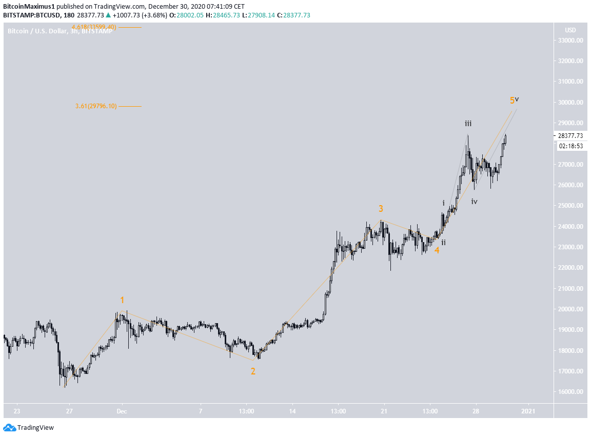 Um alvo semelhante de $ 29.357 é encontrado usando a extensão de 4,61 de Fibo da sub-onda 1.