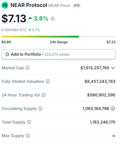 O NEAR é a única criptomoeda entre as Top 20 em valor de mercado a operar em uma alta considerável hoje. Com isso, seu preço voltou a ficar acima do nível de US$ 7.