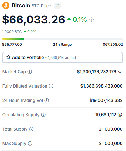 O Bitcoin opera de forma discreta, com seu preço praticamente não apresentando oscilações nas últimas 24 horas. No entanto, o ativo está muito próximo da marca de US$ 66.000.