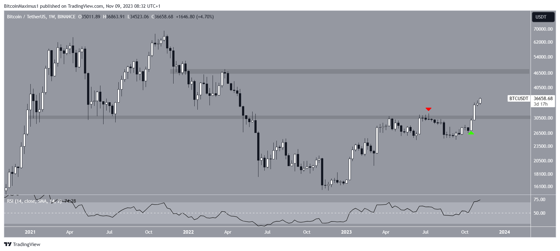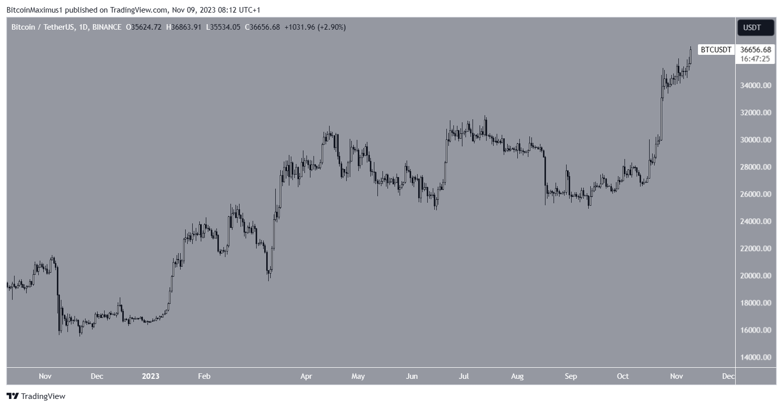 Nesta quinta-feira (9), o Bitcoin (BTC) ultrapassou o nível de US$ 36.000 – valor não alcançado desde maio de 2022.
