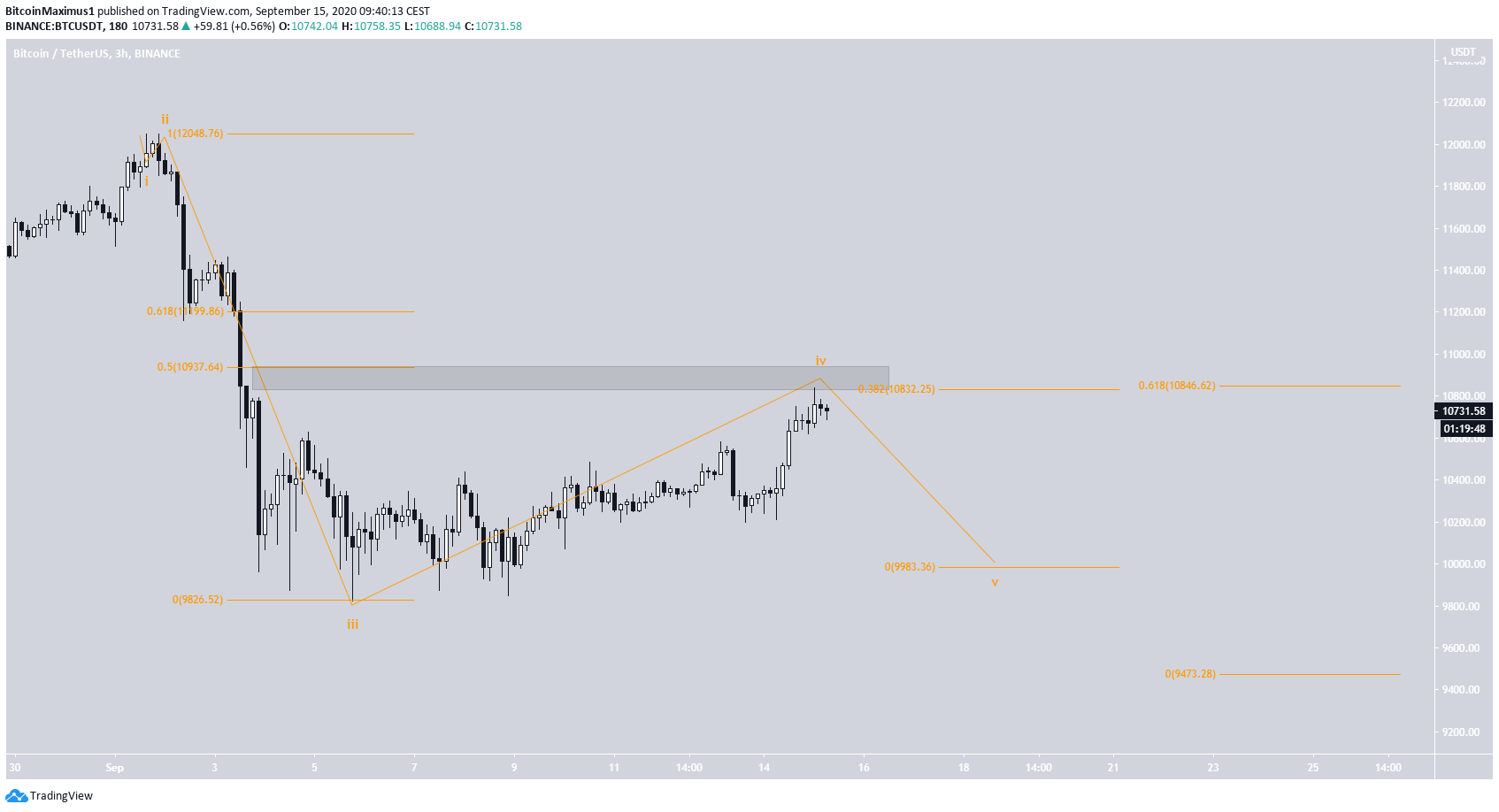 Além disso, o nível de 0,5 de Fibo da onda 3 (laranja) é encontrado em $ 10.951, dando alguma confluência de Fibo para a alta atual.