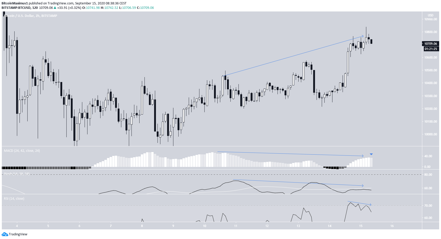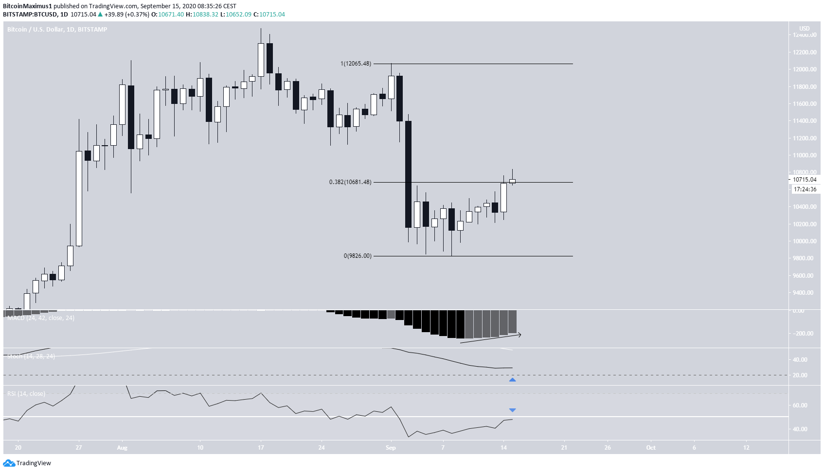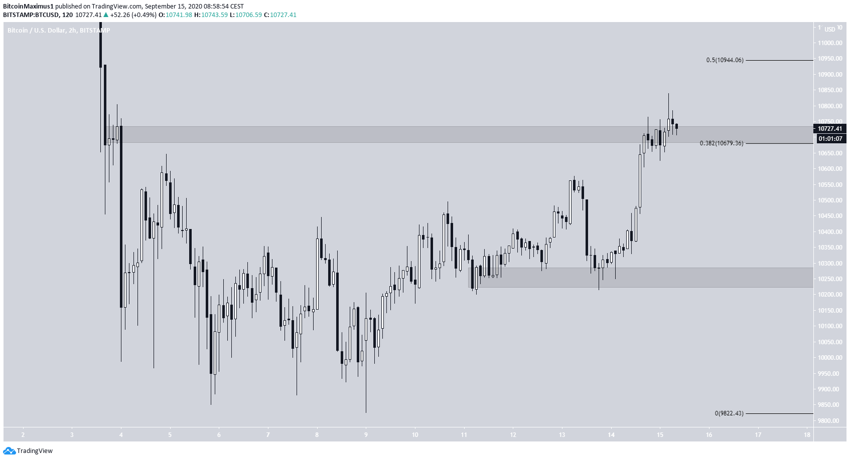 O preço do Bitcoin tem subido desde que atingiu a mínima local em 8 de setembro. O aumento foi gradual, mas acelerou no dia 14 de setembro, quando o preço criou um candle de alta que engolfava. Desde a queda no início de setembro, o BTC só conseguiu atingir uma alta local de $ 10.839.