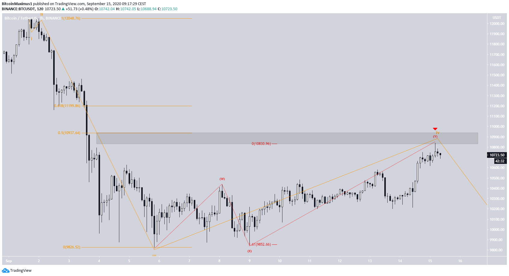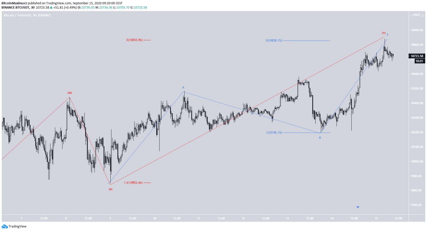 A correção complexa tem uma estrutura W-X-Y (em vermelho abaixo). Até o momento desta publicação, a cotação havia atingido a máxima de $ 10.831, o que torna a relação entre as ondas W e Y 1: 1,61, um nível comum para tais correções.