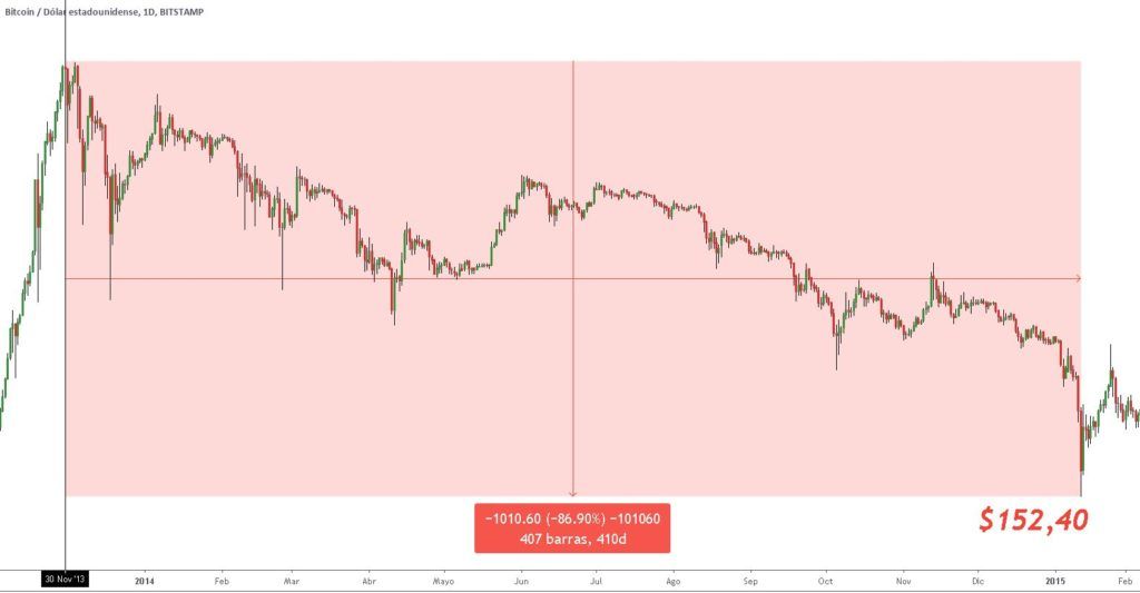 A partir de 30 de novembro de 2013 até o próximo ano e 2 meses, a correção deixou o Bitcoin 410 dias de retornos negativos, equivalentes a mais de -86%.