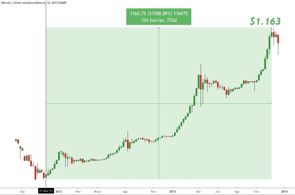 O primeiro mercado autêntico de alta do Bitcoin durou 740 dias, um pouco mais de 2 anos, e aumentou seu preço em mais de 51.000%. O preço passou de US$ 2,25 para US$ 1.163 num movimento parabólico, já que a estrutura de preços da criptomoeda principal normalmente é desenhada.
