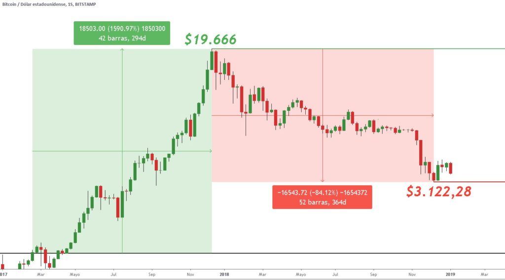 Em seguida, o ciclo se inverteu em favor dos ursos novamente, varrendo todas as esperanças de alta pelos próximos 364 dias e levando o preço do BTC para baixo em mais de 84%, caindo para US$ 3.100.