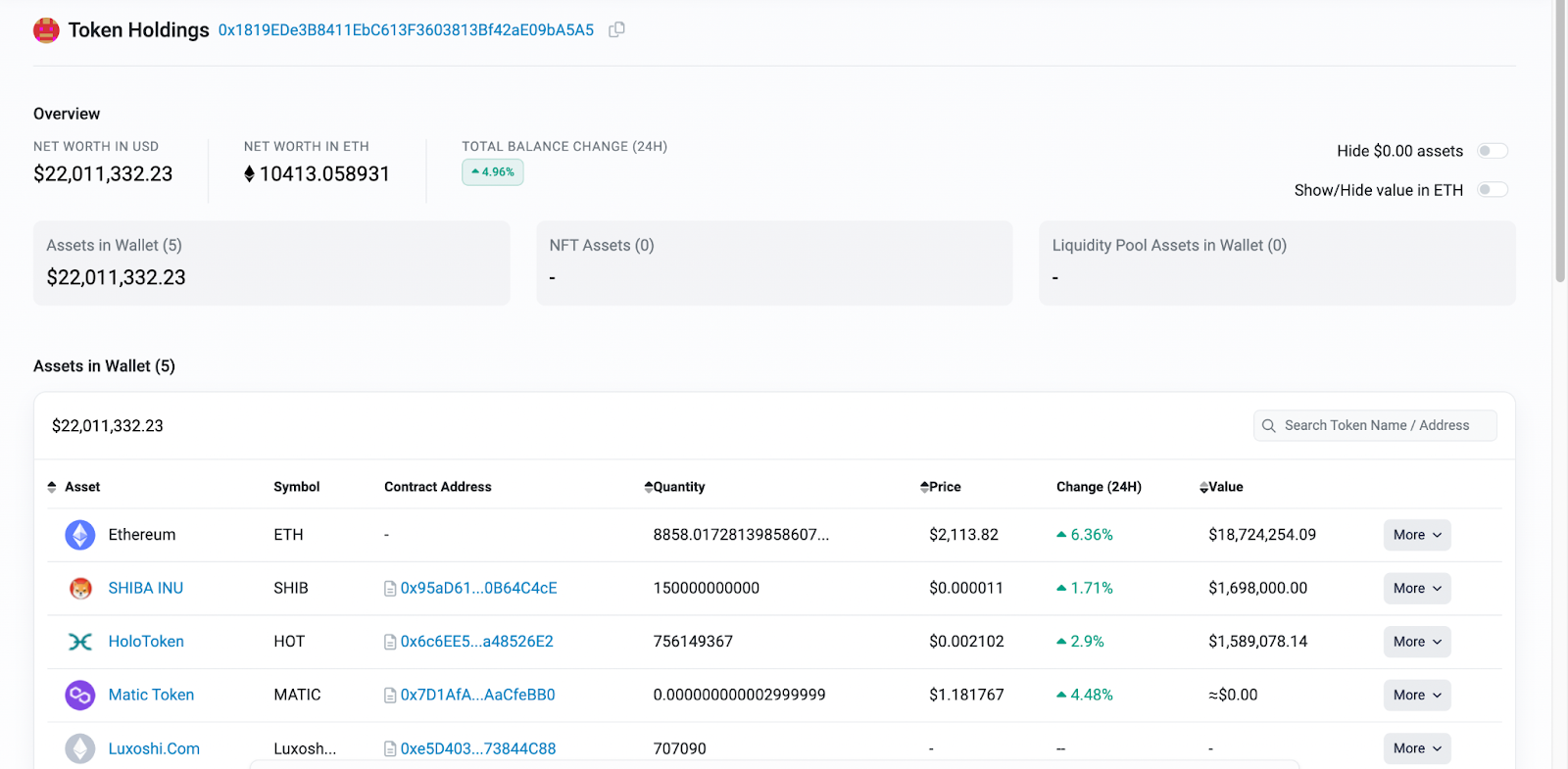 Além disso, o drenador recebeu 173.000 Quant (QNT), 172,55 bilhões de Shiba Inu (SHIB), 46,4 milhões de GALA, 756,15 milhões de Holo (HOT) e 310.000 Polygon (MATIC).