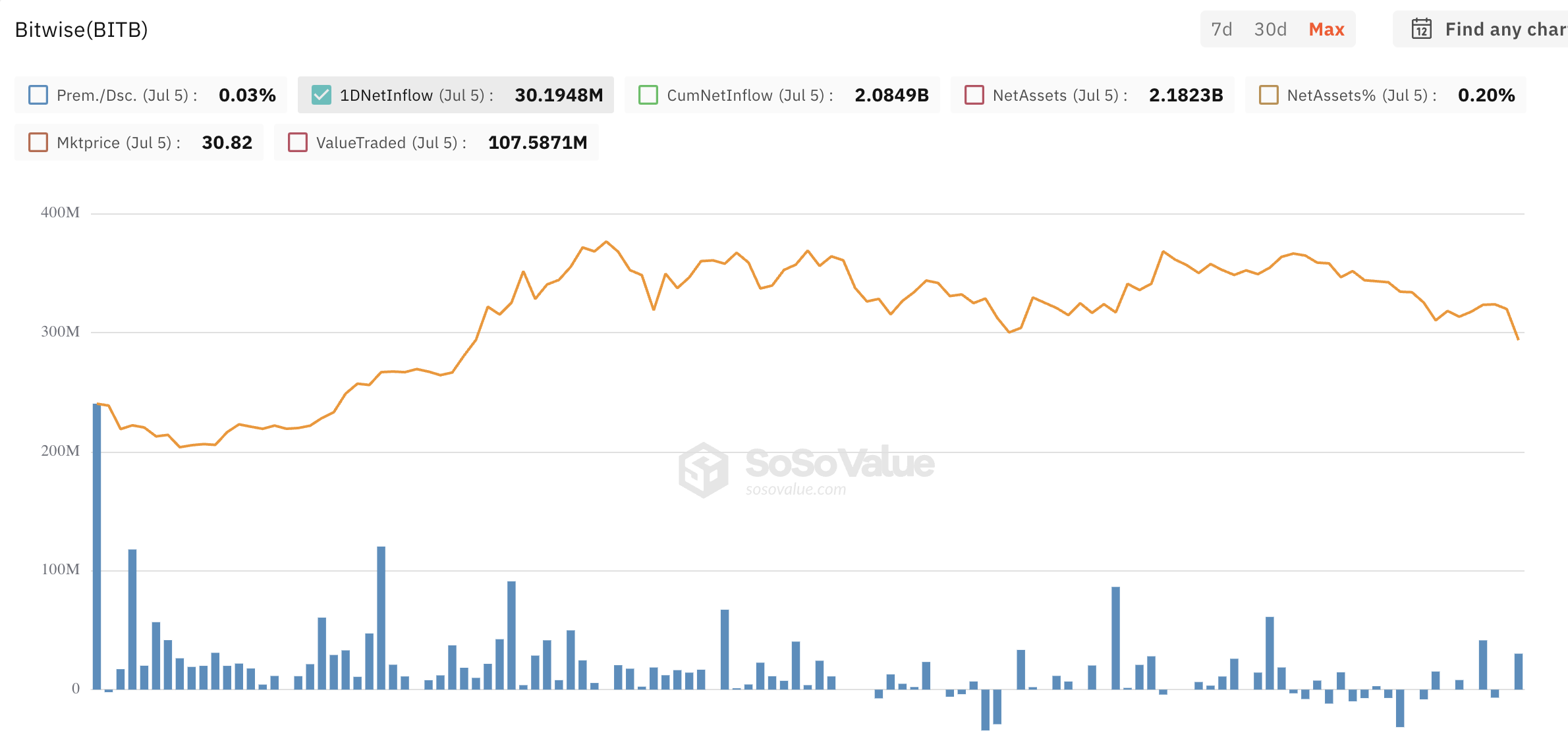 De acordo com dados da SoSoValue, o BITB atraiu entradas de US$ 2,08 bilhões em 5 de julho. O ETF tem ativos líquidos no valor de US$ 2,18 bilhões.