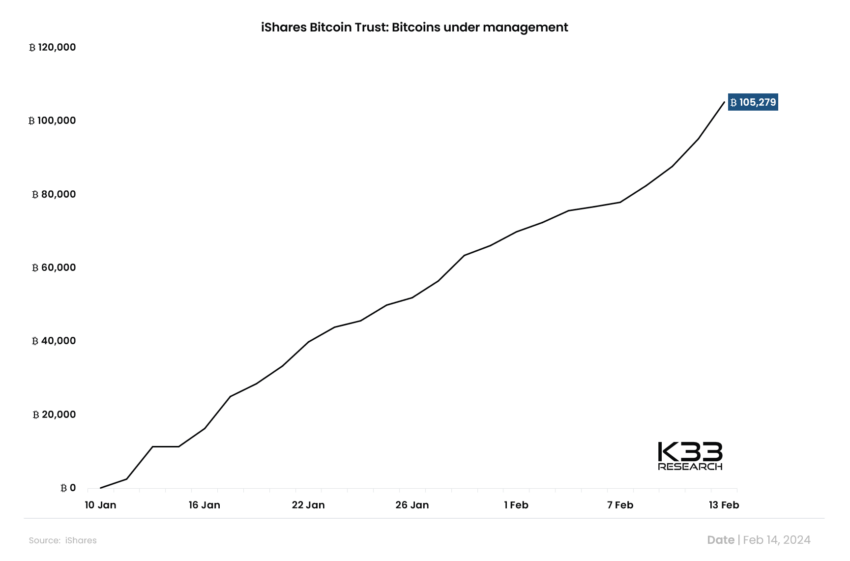 Dados da K33 Research revelaram que o ETF de Bitcoin da BlackRock – iShares Bitcoin Trust (IBIT) – ultrapassou os 100.000 Bitcoins sob gestão.