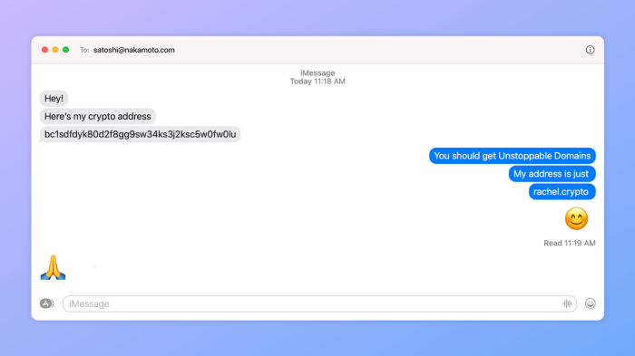 “Agora, ao enviar dinheiro para amigos, em vez de colar um endereço criptográfico (ou seja, bc1qw508d6qejxtdg4y5r3zarvary0c5xw7kv8f3t4), você tem a opção de simplesmente digitar um domínio fácil de lembrar (ou seja, brad.crypto).”