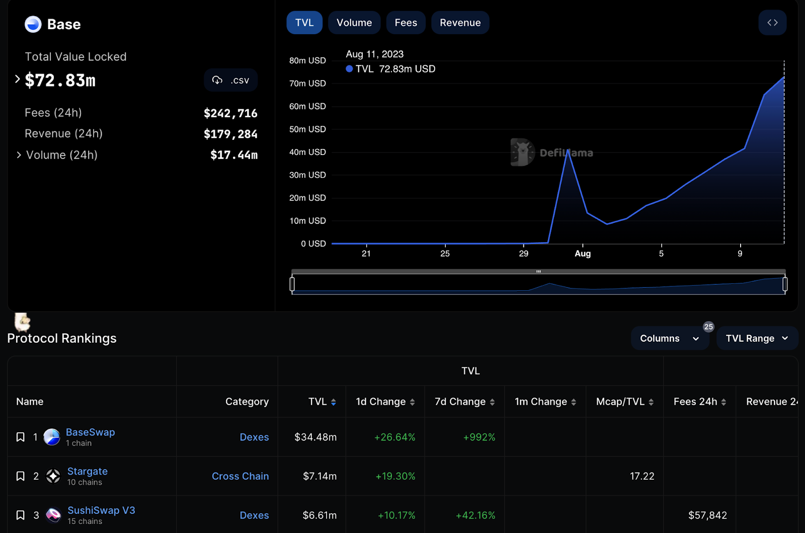 O valor total bloqueado (TVL) da Base é de US$ 72,83 milhões, com a BaseSwap contribuindo com quase 50% deste montante. O TVL aumentou mais de 70% em uma semana, quando a rede foi lançada ao público com mais de 100 aplicativos descentralizados (dApps).