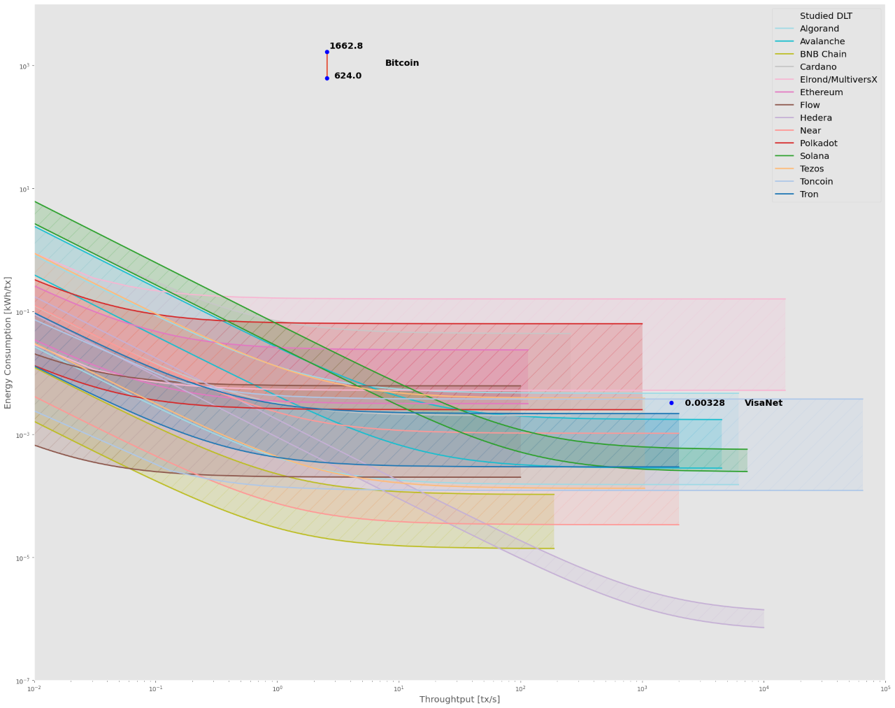 Como os dados mostram, o Bitcoin se destaca acima de todas as blockchains PoS analisadas em termos de consumo elétrico. O estudo concluiu que “todas as DLTs baseadas em PoS (Distributed Ledger Tokens) analisadas têm um consumo de energia que é negligenciável em comparação com o das principais blockchains PoW. Na medida em que o consumo de energia pode ser considerado problemático, isso não é um problema em nenhum design PoS.”