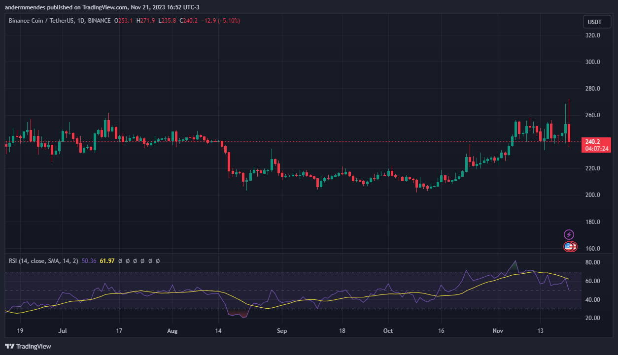 Como é possível observar no gráfico semana, o BNB entrou em um período de acumulação no dia 7 de novembro, sendo negociado desde então entre US$ 230 e US$ 270.