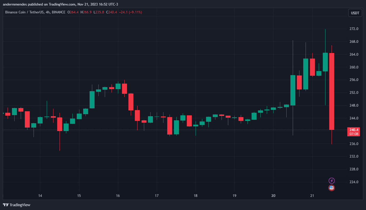 No entanto, o token nativo da exchange não fico ileso a saída de CZ. A criptomoeda acumula uma desvalorização de cerca de 10% somente nas últimas 24 horas, segundo o TradingView.