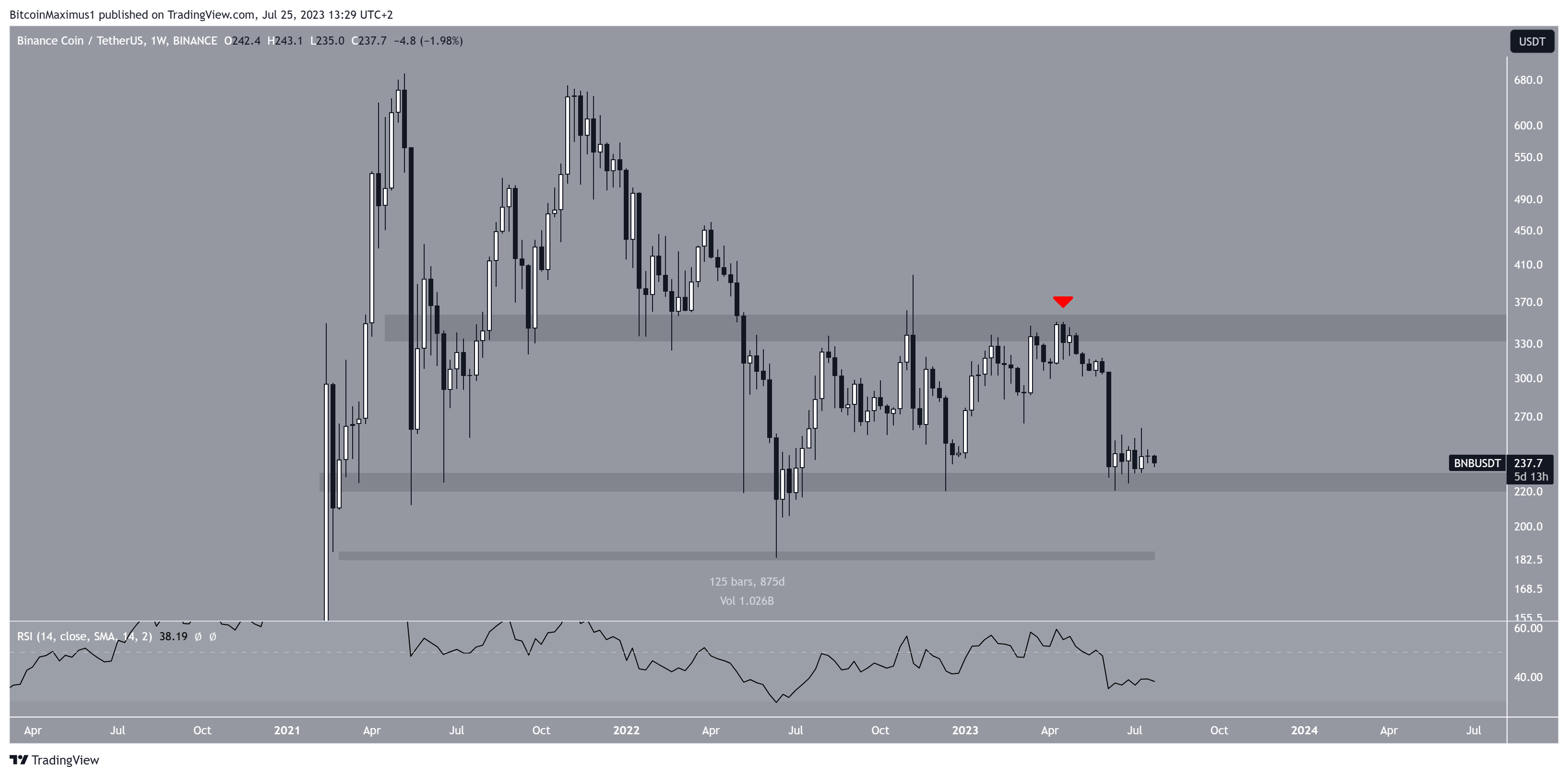 O BNB, token nativo da Binance, é negociado dentro de uma área de suporte que está em vigor há 875 dias. A estrutura é crucial para a preservação da tendência de alta.