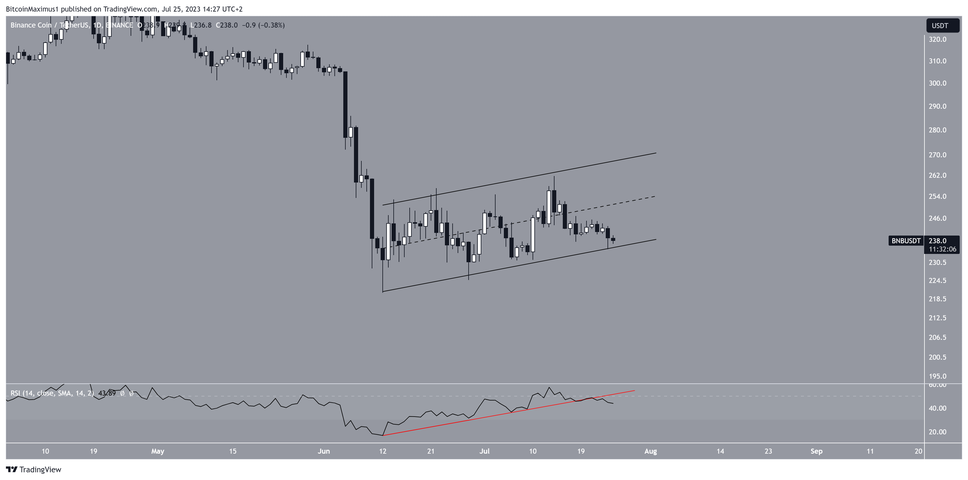 A análise técnica do gráfico diário fornece uma previsão de preço de baixa. A principal razão para isso é a movimentação do preço, mas o RSI também indica este cenário. Desde o fundo de 10 de junho, o BNB foi negociado dentro de um canal paralelo de alta.