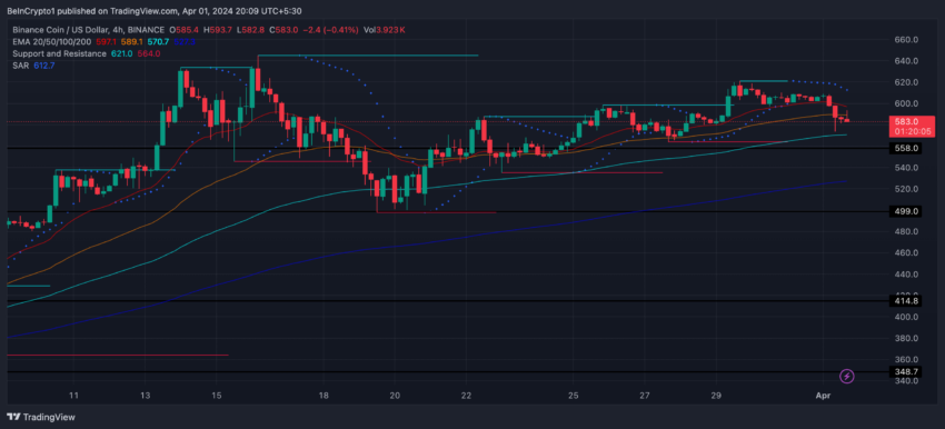 Entre 28 e 31 de março, o BNB passou por uma fase de alta, evidenciada por sua métrica SAR (Stop and Reverse), durante a qual seu preço subiu de US$ 564 para US$ 620.