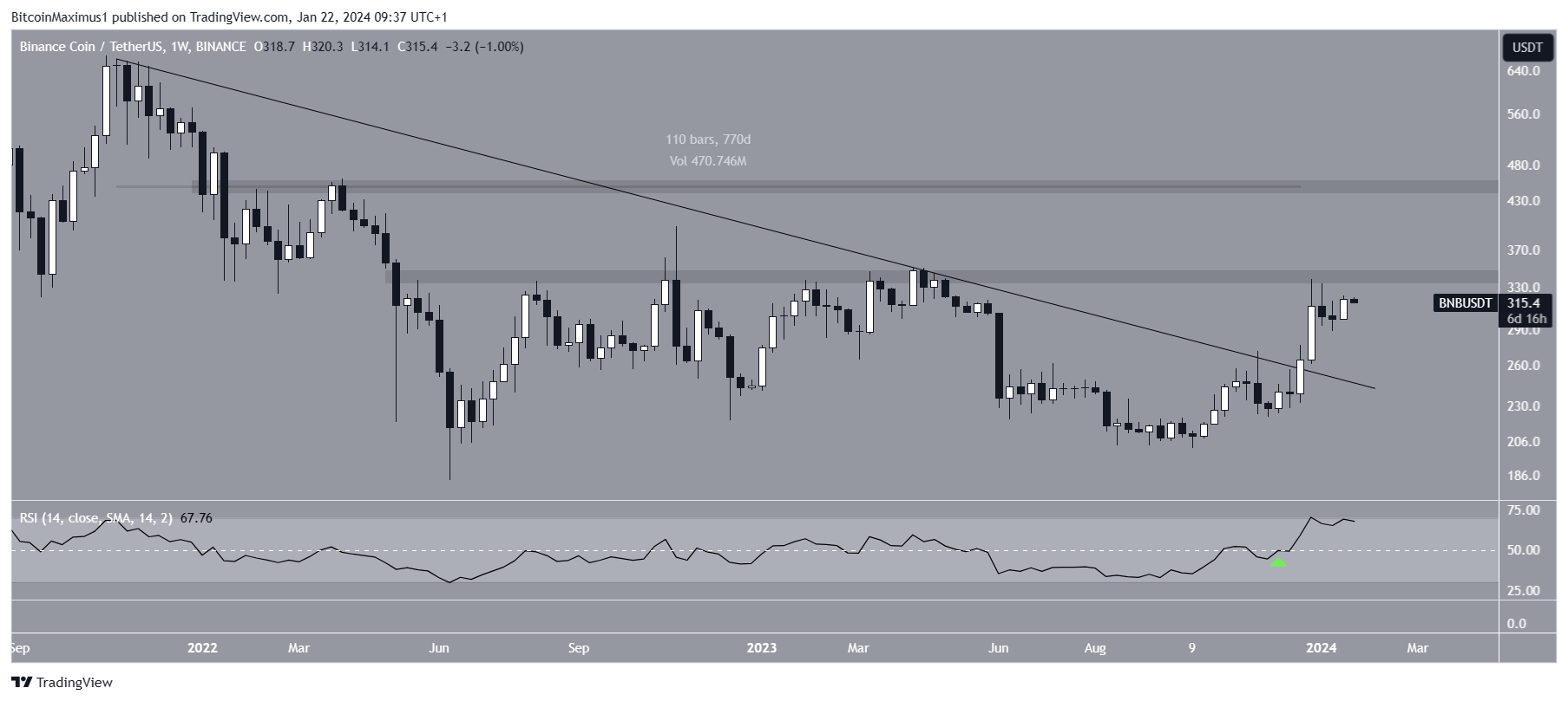 O BNB caiu abaixo de uma linha de tendência de baixa de longo prazo desde novembro de 2021, levando a uma mínima de US$ 183 em junho do próximo ano. O preço subiu desde então.