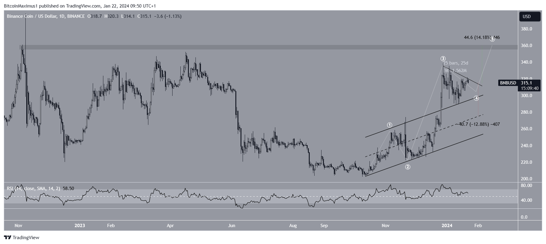A contagem de ondas apoia esta perspectiva. A mais provável sugere que o BNB está na onda quatro de um movimento de cinco ondas (branco). A onda quatro tornou-se um triângulo simétrico, o padrão mais provável para tal correção.