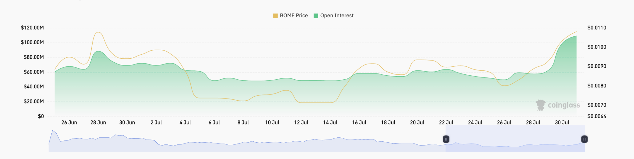 Atualmente, o OI de futuros da moeda meme era de US$ 109,22 milhões, o que representa um aumento mais de 100% nos últimos sete dias. De acordo com a Coinglass, ele atingiu seu ponto mais alto nos últimos 30 dias.