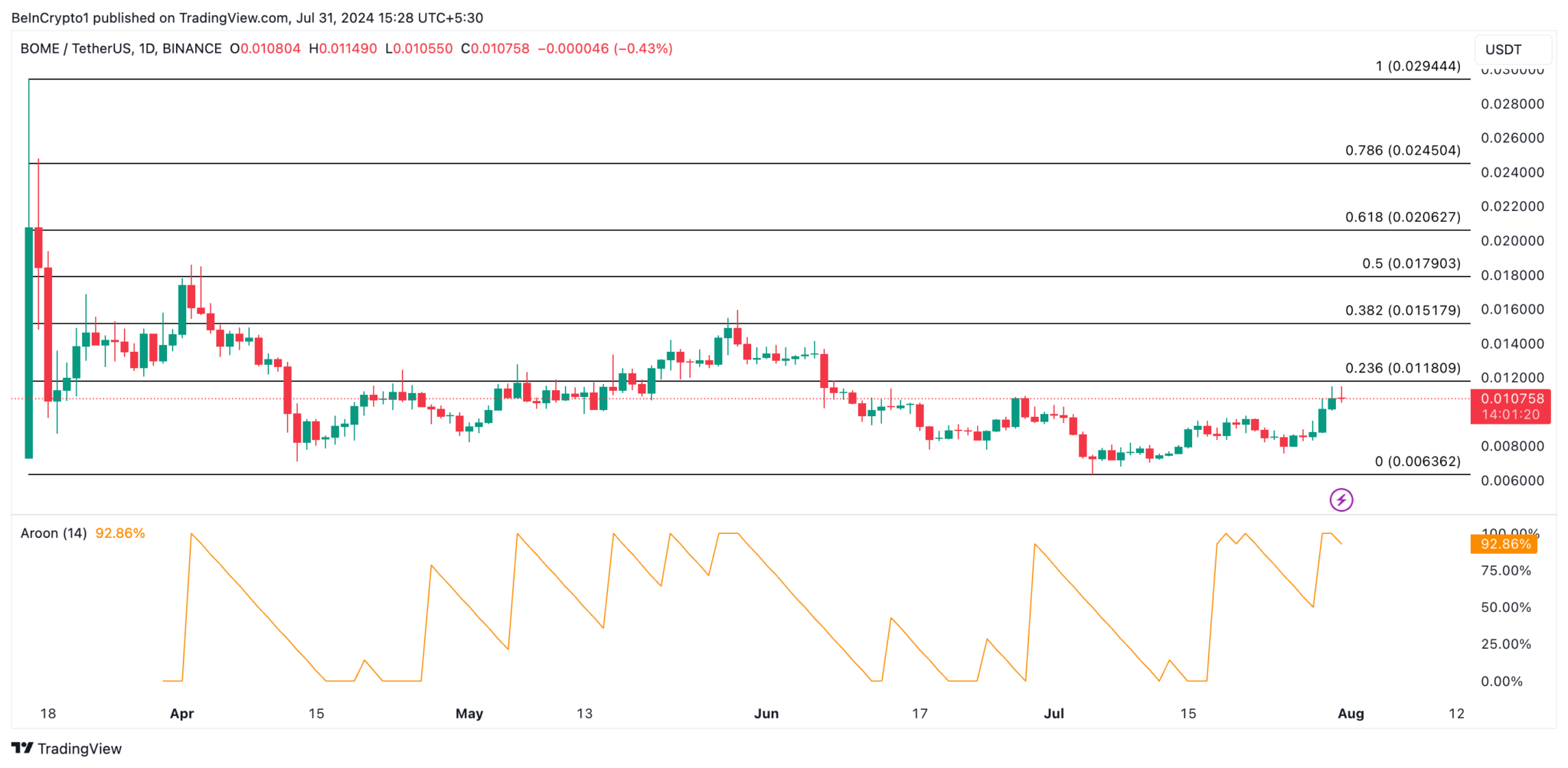 A BOME ultrapassou a linha de resistência de seu canal horizontal durante o início dessa semana. Desde então, manteve uma tendência de alta, subindo 6%. Até o momento, a altcoin está negociada a US$ 0,010.