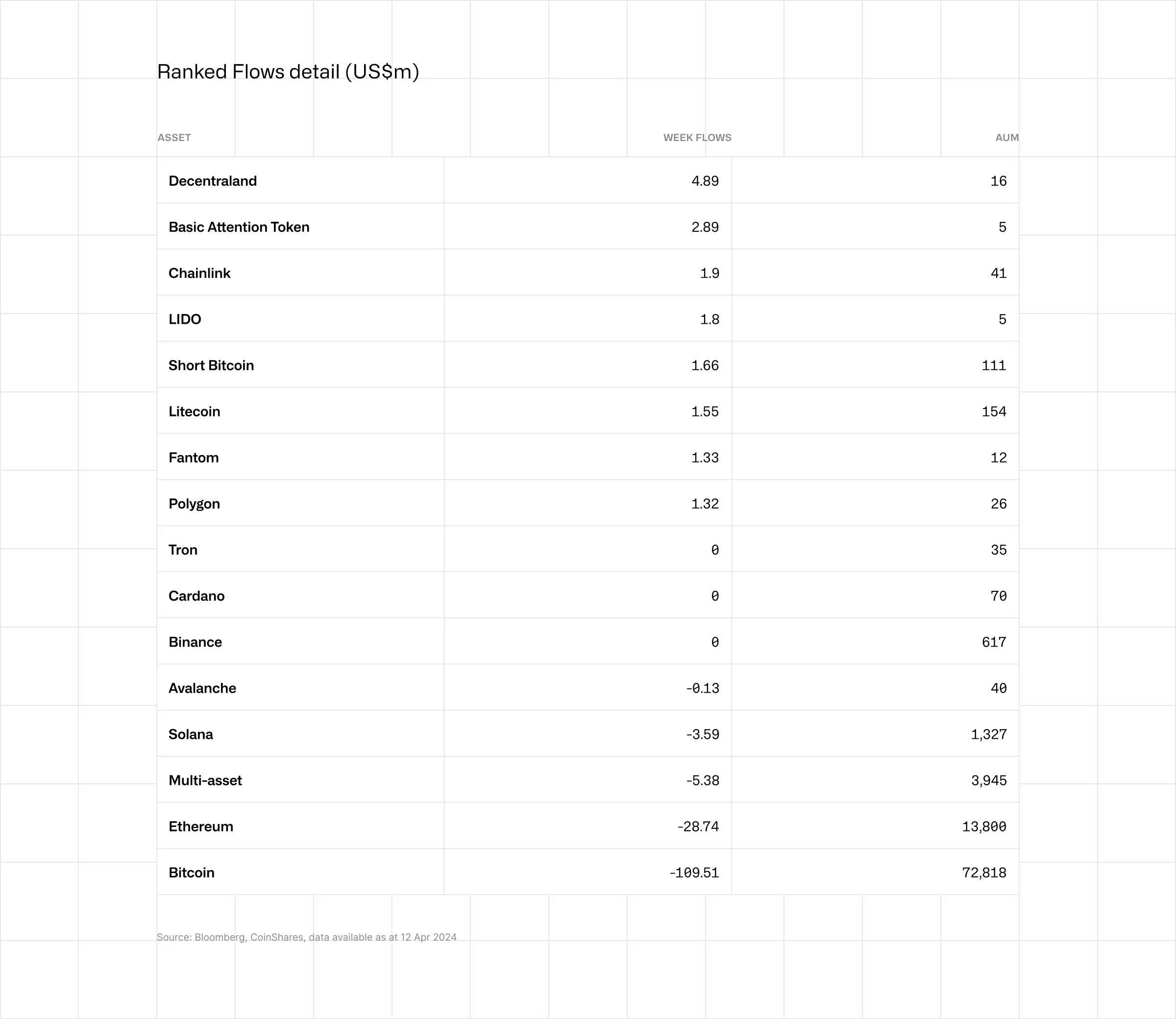 Decentraland, Basic Attention Token, Chainlink e LIDO tiveram entradas melhores. De quase US$ 5 milhões, US$ 2,89 mi, US$ 1,9 mi e US$ 1,8 mi respectivamente.