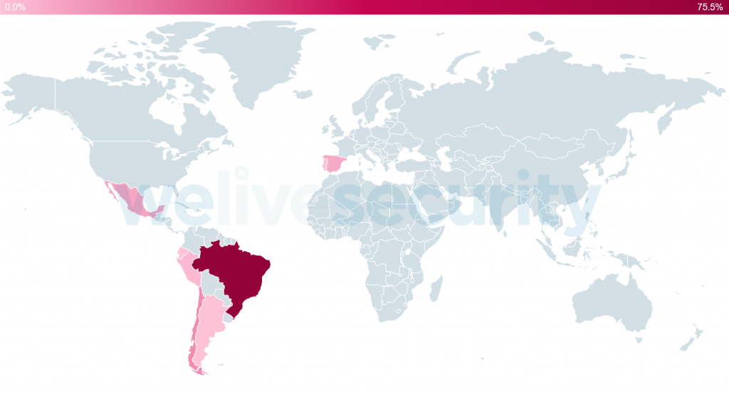O Brasil é apontado como o país mais afetado. Na sequência aparecem outros na América Latina, como Chile, México e Peru. Como ele vem configurado para espanhol e português, também acaba atingindo pessoas em Portugal e na Espanha.