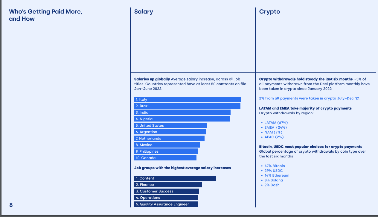 SponsoredO uso de criptomoedas para remuneração salarial está em alta, com um aumento significativo de 2% para 5% no período entre o segundo semestre de 2021 e os primeiros meses de 2022, conforme levantamento da Deel. Empresa que ajuda empresas a contratar, integrar e pagar pessoas em outros países. Foram analisados dados de mais de 100 mil contratos de trabalho em 150 países, durante seis meses (período de janeiro a junho de 2022).