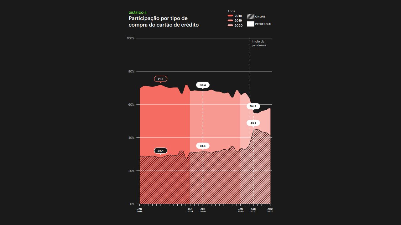 A fintech vê um rápido crescimento em transações digitais no país. Em meio à pandemia, o brasileiro reduziu fortemente as compras presenciais. Enquanto isso, as compras online com cartão de crédito crescem nos últimos três anos.