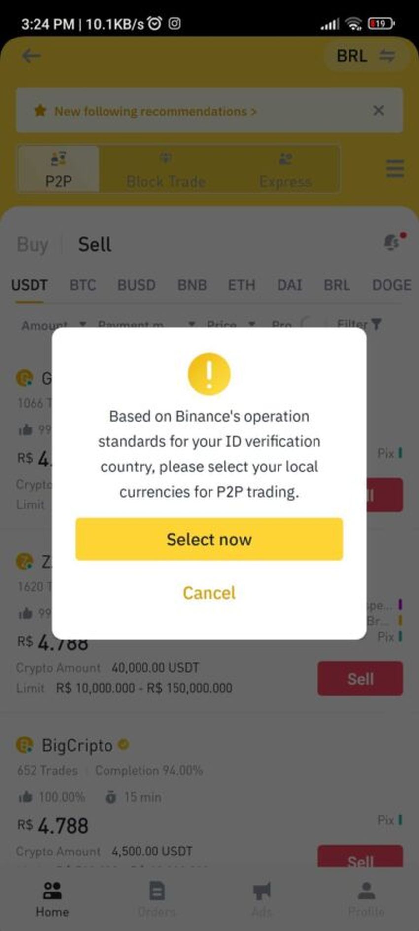 Com a mudança, quem tenta comprar ou vender BRL sem ser registrado no país recebe a mensagem “De acordo com a verificação de identidade do seu país registrado na Binance, selecione sua moeda local para trocas P2P”.