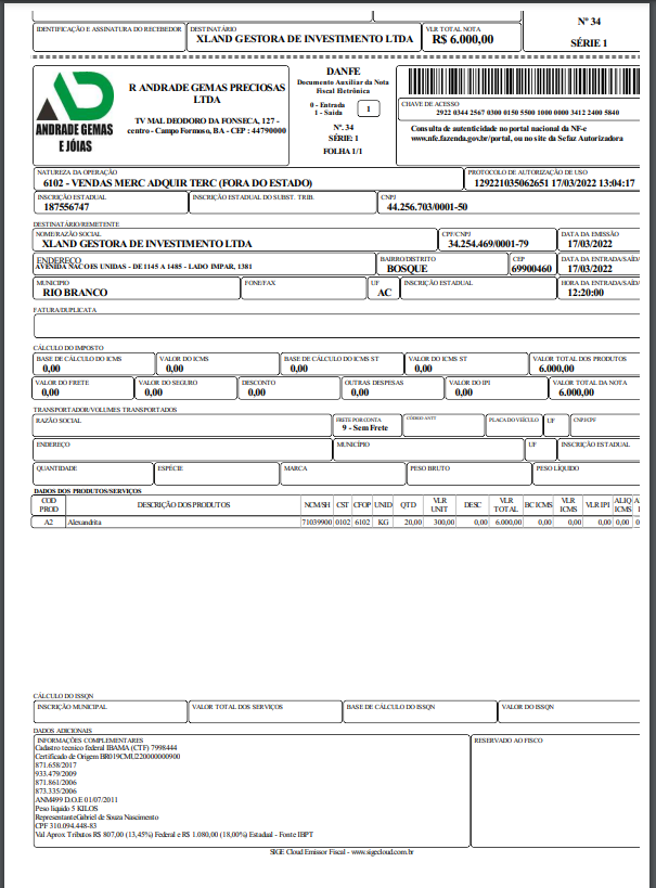 No entanto, na nota fiscal, o valor que consta destas pedras é de apenas R$ 6 mil. Bem aquém do valor citado por Gabriel.