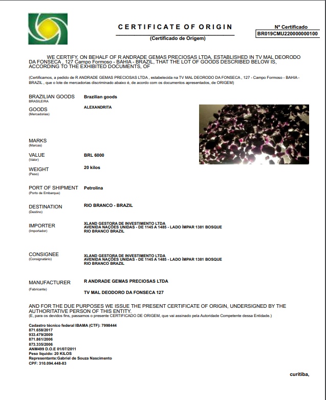 Outra ferramenta usada pela Xland para enganar os clientes, foi dar a garantia de lastro com pedras preciosas. Eles apresentavam até certificado de origem das gemas, trazendo mais seriedade ao golpe. Só que no certificado o endereço que consta é R. Andrade Gemas Preciosas Ltda, de Campo Formoso, na Bahia.