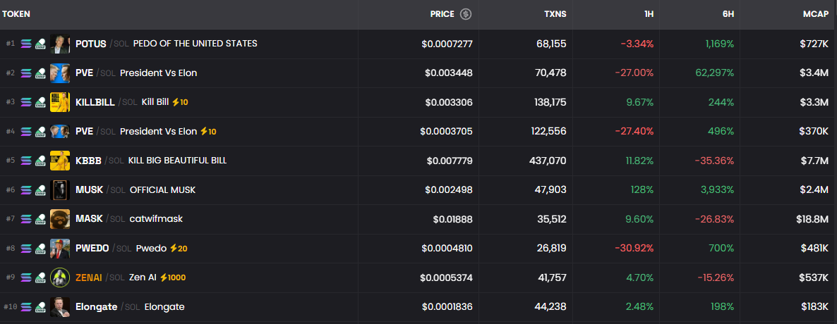 Na Solana DEX, quase todas as memecoins em destaque neste momento giram em torno da disputa entre Trump e Elon Musk. Alguns desses tokens já acumulam valor de mercado próximo de US$ 7 milhões apenas hoje.