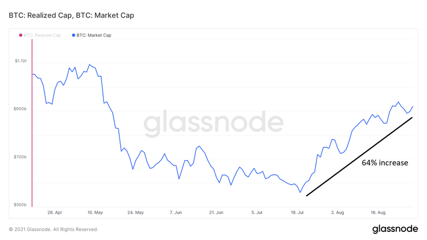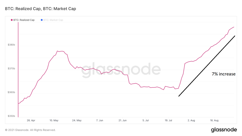 Um desenvolvimento interessante é o fato de que o RC não aumentou tanto em comparação ao MC, quando analisado a partir da baixa mais recente do BTC no dia 20 de julho. Durante este período, o RC aumentou 7%.
