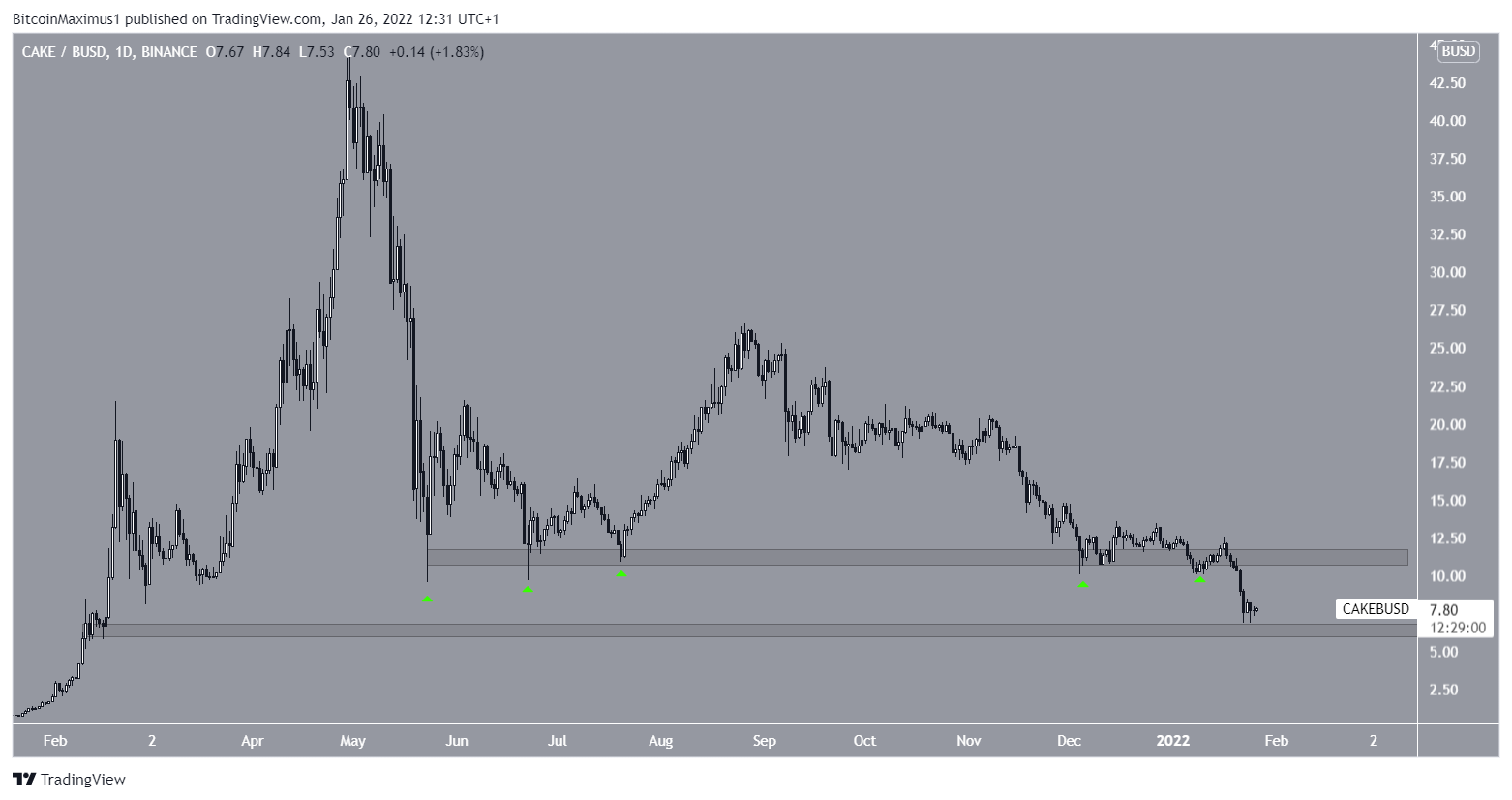 CAKE está em tendência de baixa desde 30 de abril, quando atingiu o preço recorde de US$ 44,18. Inicialmente, o token saltou acima da área de US$ 11,5 cinco vezes (ícones verdes), antes de finalmente romper abaixo em 13 de janeiro.