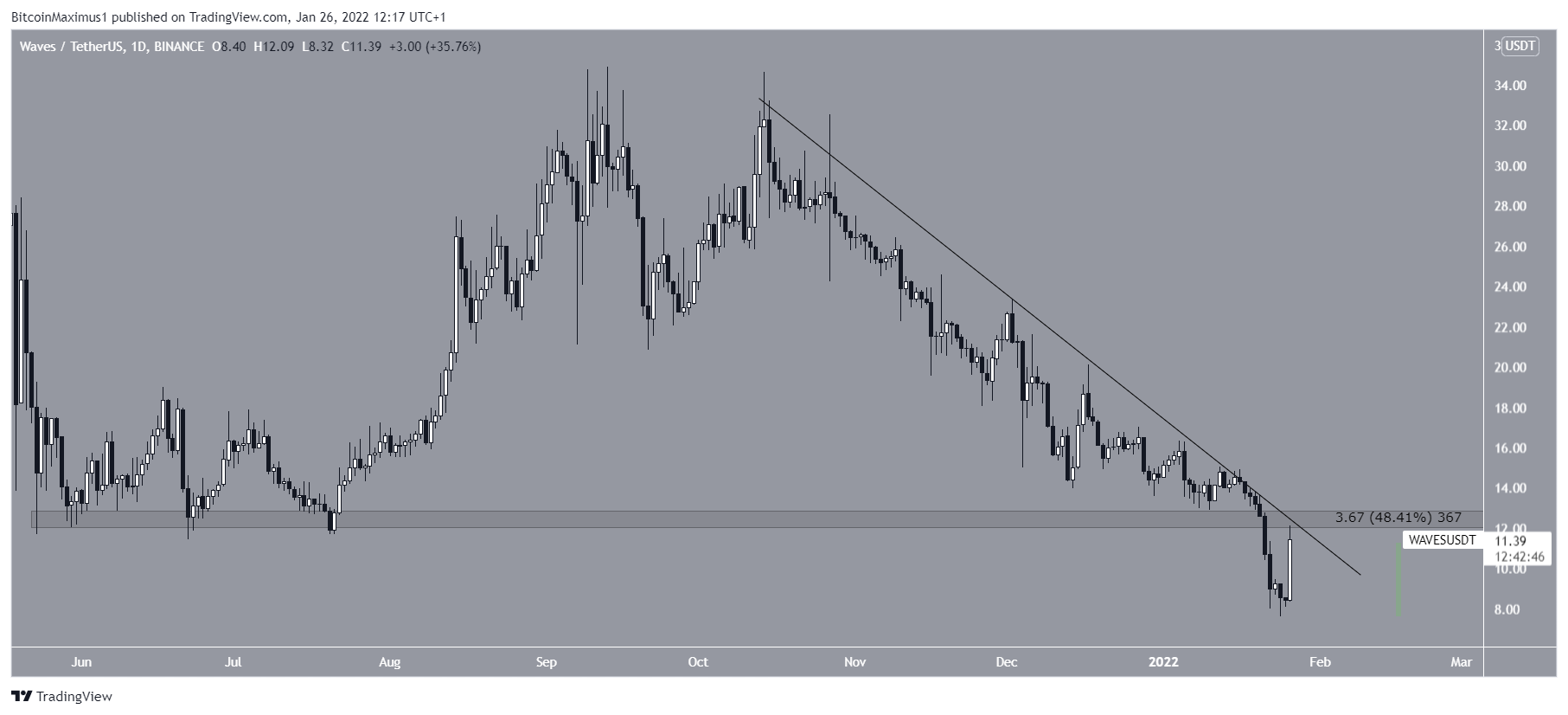 A WAVES está seguindo uma linha de tendência de baixa desde 14 de outubro. O movimento levou a uma mínima de US$ 7,56. No entanto, o token saltou logo em seguida e subiu 48,41% desde então.