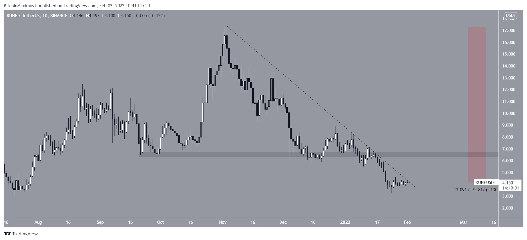 A RUNE está seguindo uma linha de tendência de baixa desde 2 de novembro. Até agora, o movimento de queda levou a uma mínima de US$ 3,25, o que representou uma desvalorização de 76%.
