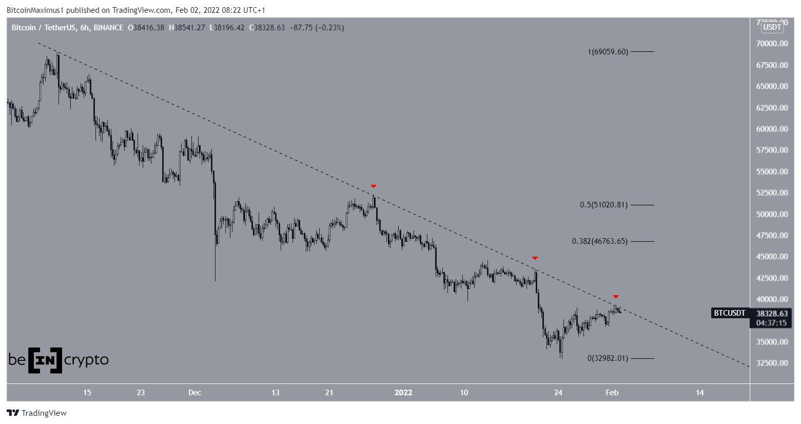 O BTC segue uma linha de tendência de baixa desde 10 de novembro. Até agora, o ativo fez três tentativas de rompimento desta linha (ícones vermelhos), a mais recentemente na terça-feira (1).