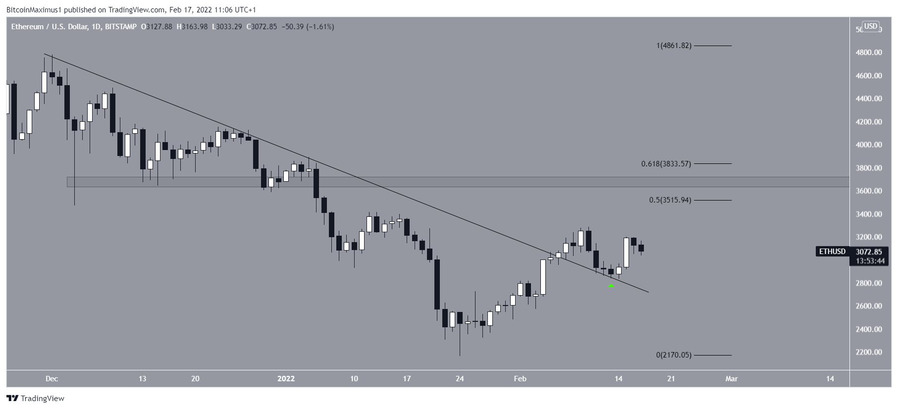 No dia 6 de fevereiro, o ETH rompeu uma linha de tendência de baixa que estava em vigor desde 1º de dezembro. Depois, seu preço voltou para validá-la como suporte no último domingo (ícone verde). Seu preço vem subindo desde então.
