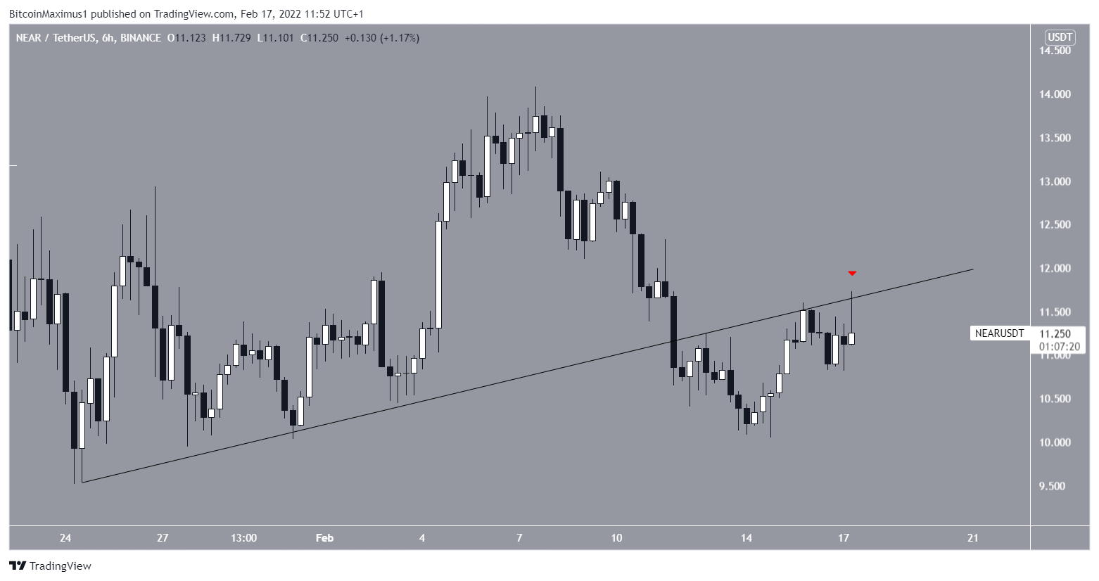 A NEAR está em tendência de baixa desde 7 de fevereiro. O movimento causou um rompimento de uma liha de tendência de alta em 10 de fevereiro.