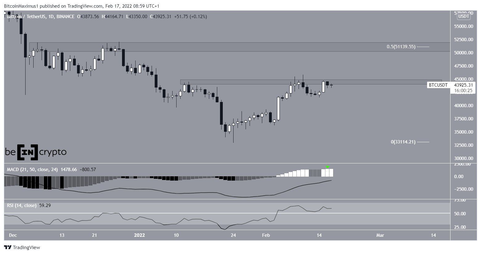 BTC está atualmente dentro da área de resistência horizontal de US$ 44.300. Desde 10 de janeiro, esta é a terceira tentativa de rompimento. Na terça-feira (15), o ativo teve o seu maior fechamento desde o início do movimento de alta atual.