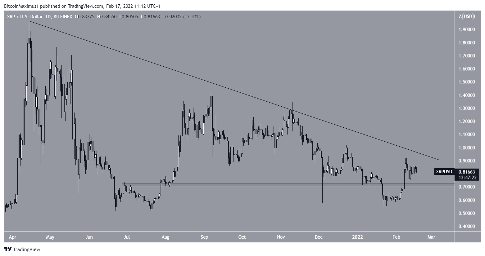 O token XRP esta seguindo uma linha de tendência de baixa desde 16 de abril. Esse movimento inicialmente causou a perca da área de suporte horizontal de US$ 0,72 no início de janeiro deste ano.