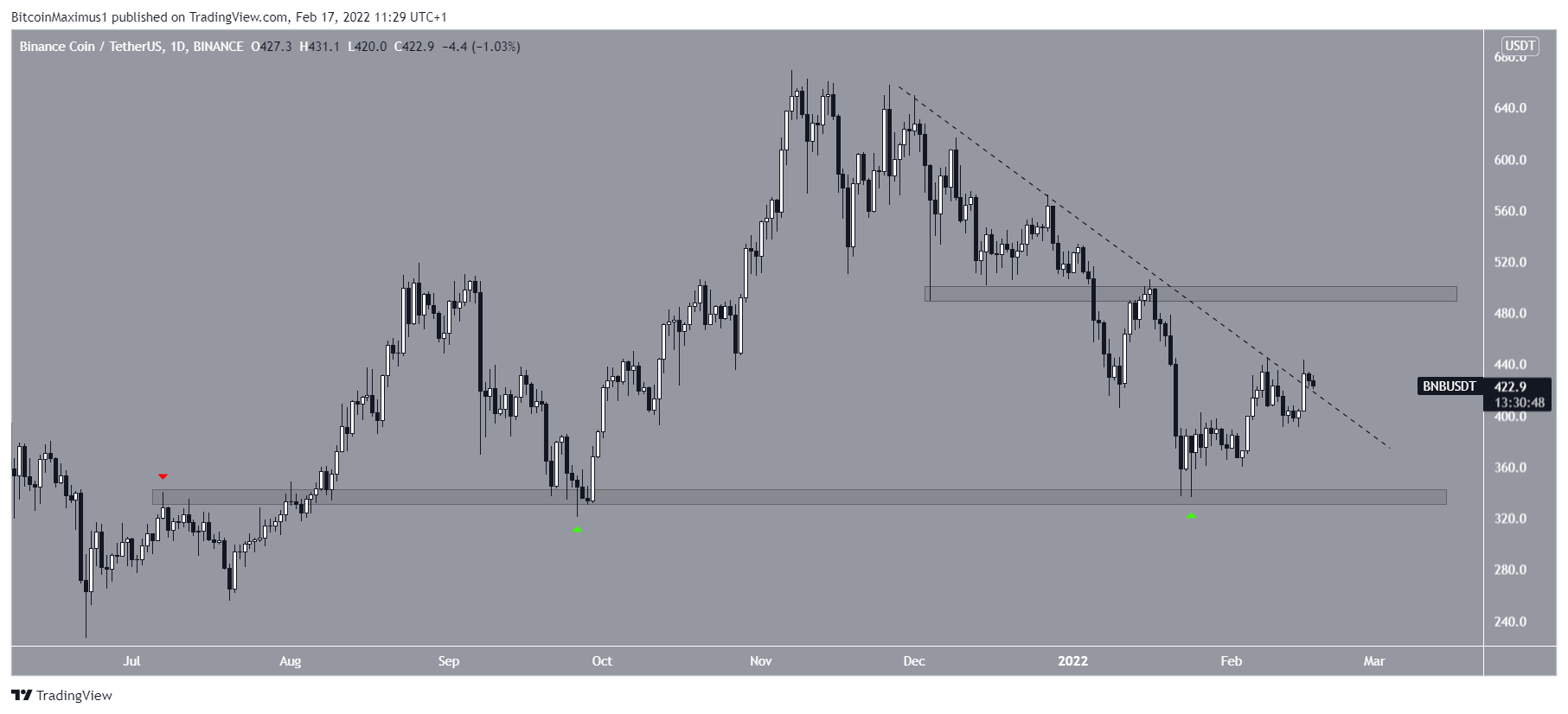Da mesma forma que o ETH, a BNB vinha caindo ao lado de uma linha de tendência de baixa desde o início de dezembro. Esse movimento de queda levou a uma mínima de US$ 336 em 24 de janeiro (ícone verde).