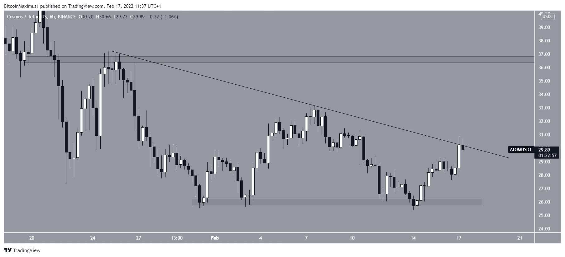 No dia 31 de janeiro, a ATOM atingiu uma mínima de US$ 31,50. Depois de cair para esse nível novamente, seu preço iniciou um movimento de alta que levou a uma máxima de US$ 33,19 em 7 de fevereiro.